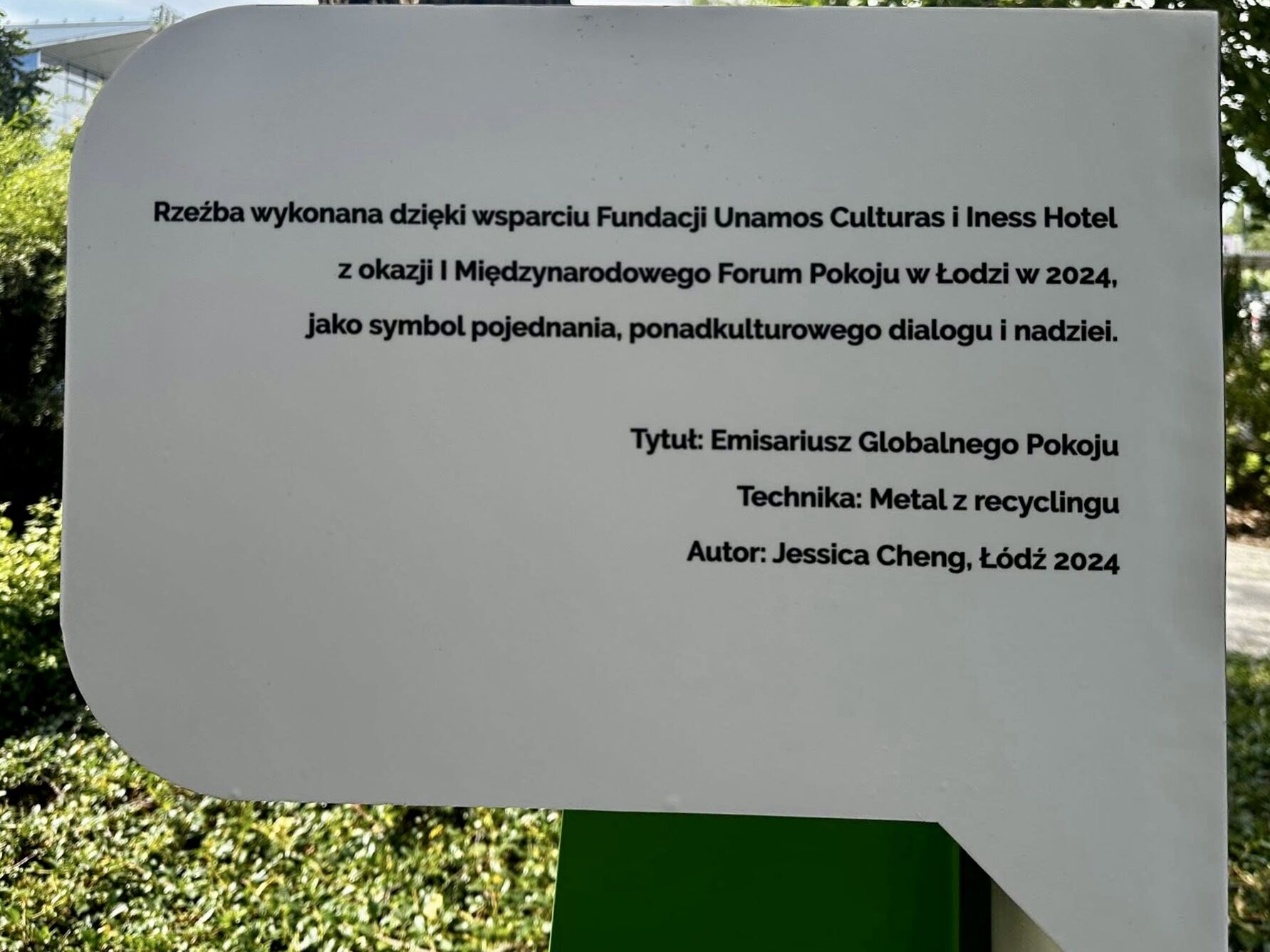 28 sierpnia 2025 roku miasto Łódź stało się miejscem odsłonięcia rzeźby „Emissary of Global Peace”, stworzonej przez kostarykańską artystkę Jessicę Cheng z wykorzystaniem metalu z recyklingu — poetyckiego gestu pamięci, przemiany i wspólnej nadziei.