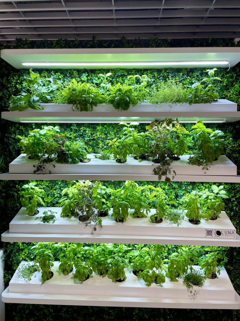 La pared vegetal llama la atención. Las plantas son hidropónicas: no necesitan suelo, solo soluciones minerales. Son fáciles de cultivar y crecen todo el año, perfectas para entornos urbanos y espacios cerrados. Aquí añaden una sensación de calma y tranquilidad que envuelve al visitante.