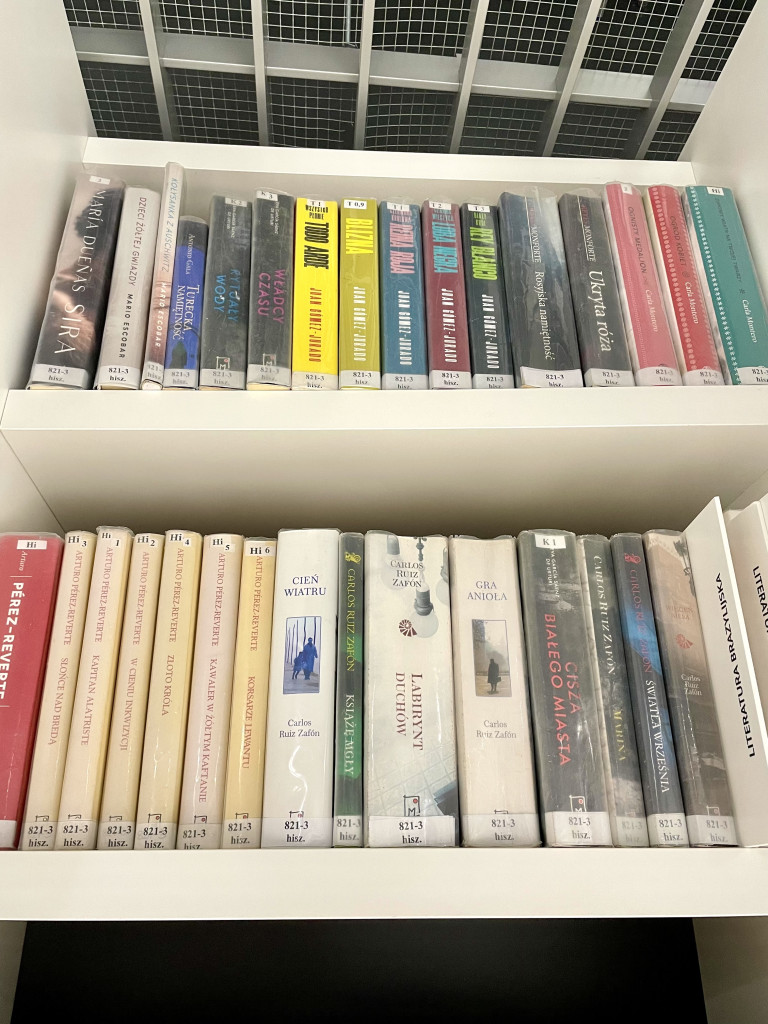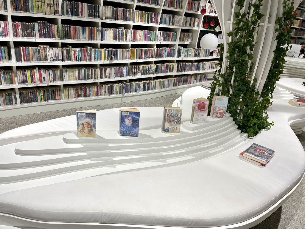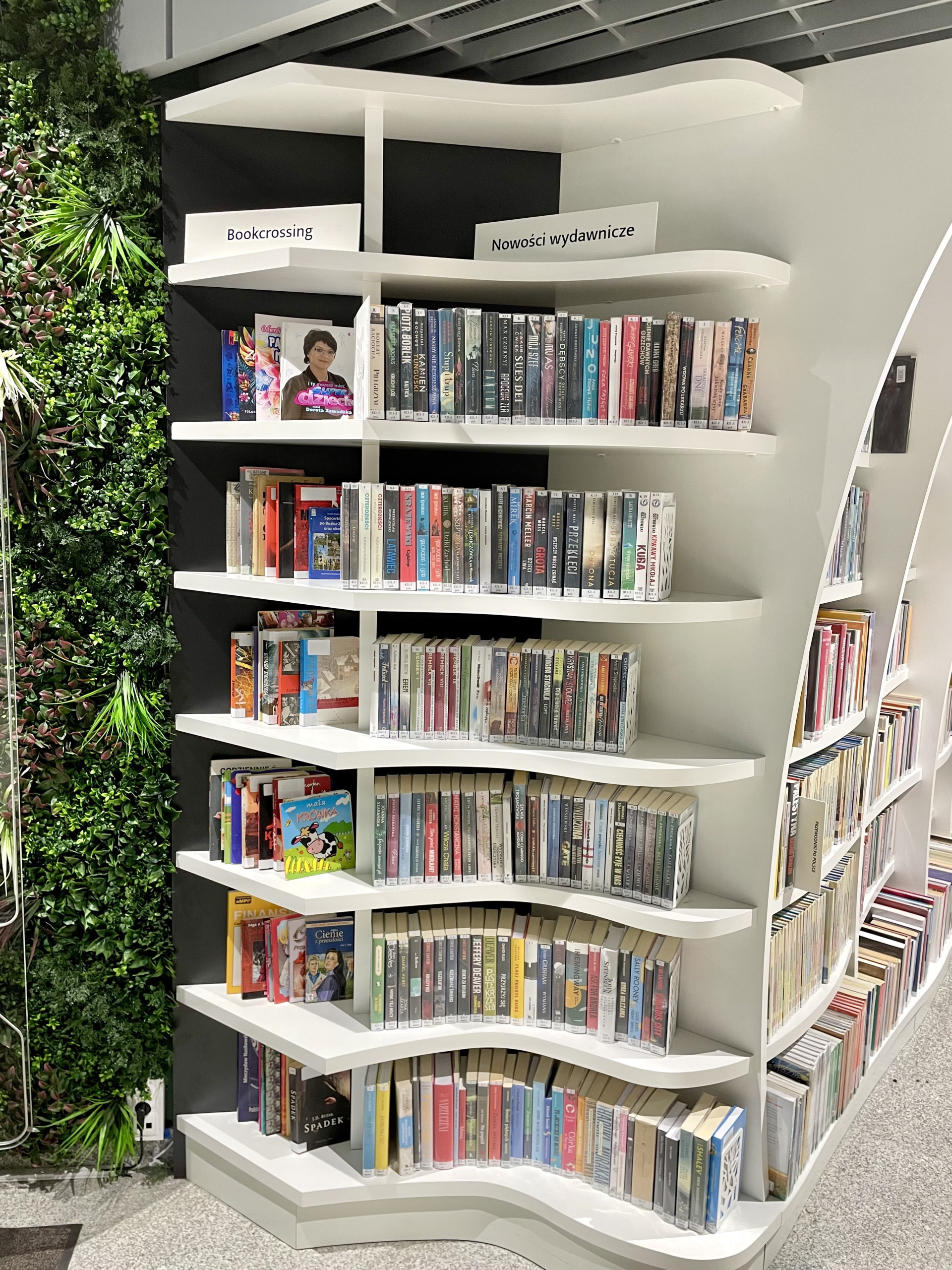 El lugar es moderno, casi futurista. Fue diseñado por GK-Atelier Grzegorz Kłoda. A pesar de su espacio reducido, alberga 10.000 volúmenes. La biblioteca ofrece ficción en polaco, pero también en ucraniano y… checo. Hay guías turísticas y una selección variada de literatura polaca, española, estadounidense, inglesa y mucho mas. Se encuentran tanto novedades editoriales como ejemplares donados.
