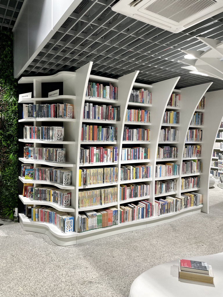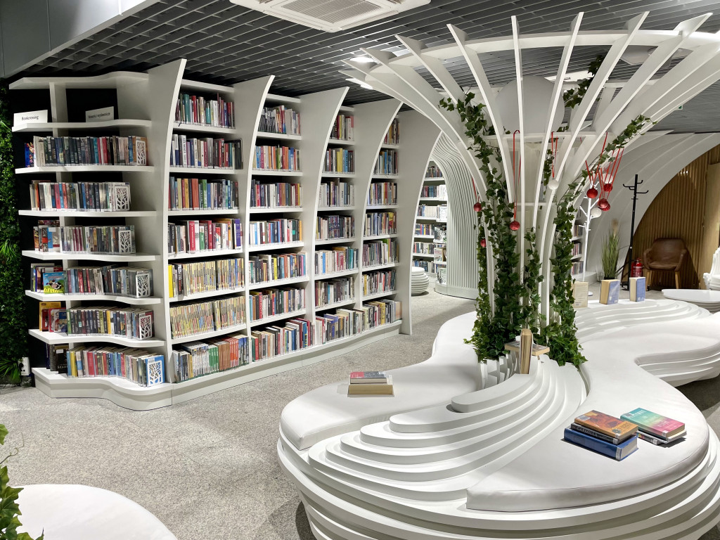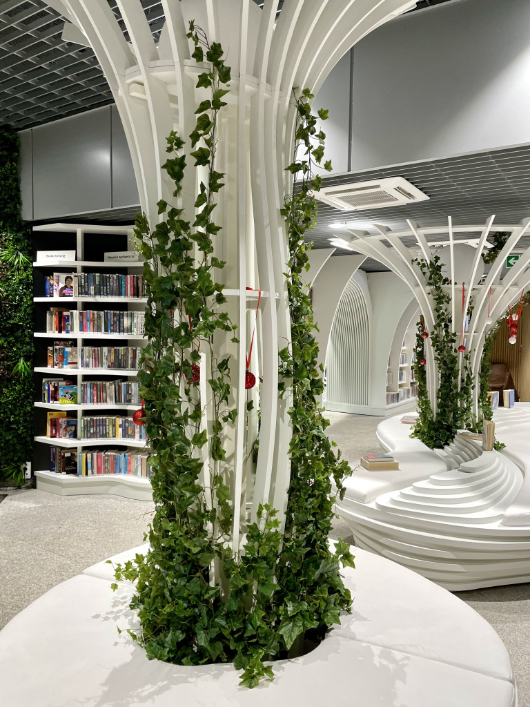 Ściana roślin przyciąga uwagę. Rośliny są hydroponiczne: nie potrzebują ziemi, tylko roztworów mineralnych. Łatwo je uprawiać i rosną przez cały rok, co czyni je idealnymi do środowisk miejskich i zamkniętych przestrzeni. W bibliotece dodają poczucia spokoju i wyciszenia, otulając odwiedzającego.