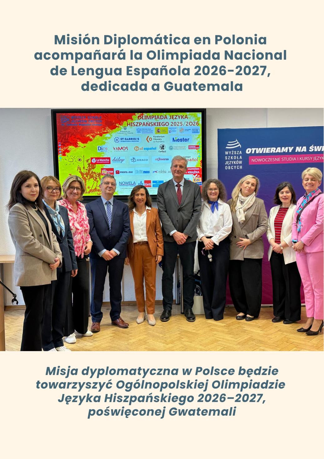Ambasada Gwatemali w Polsce będzie towarzyszyć Ogólnopolskiej Olimpiadzie Języka Hiszpańskiego 2026–2027, której edycja zostanie poświęcona Gwatemali. W ciągu najbliższych dwunastu miesięcy kraj ten stanie się główną osią programu nauczania w polskich szkołach, w ramach konkursu, który co roku gromadzi tysiące uczniów zainteresowanych językiem hiszpańskim oraz światem hiszpańskojęzycznym.